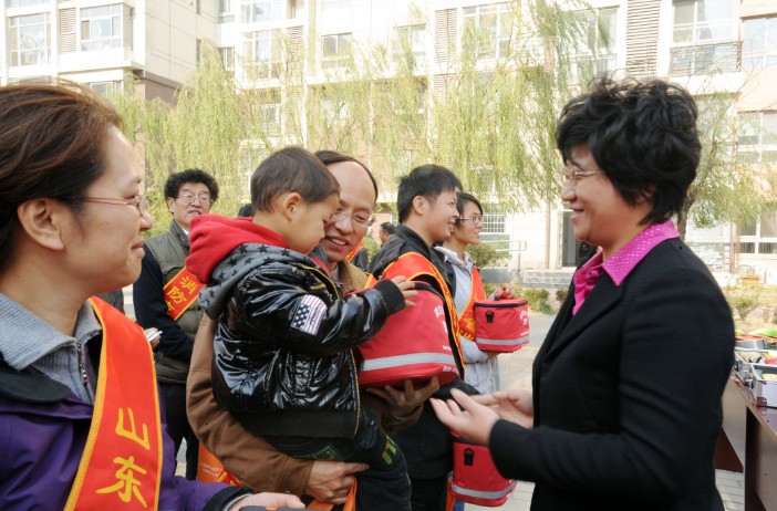 我公司董事長張旭明向11.6活動演練志愿者發(fā)放應急產品
